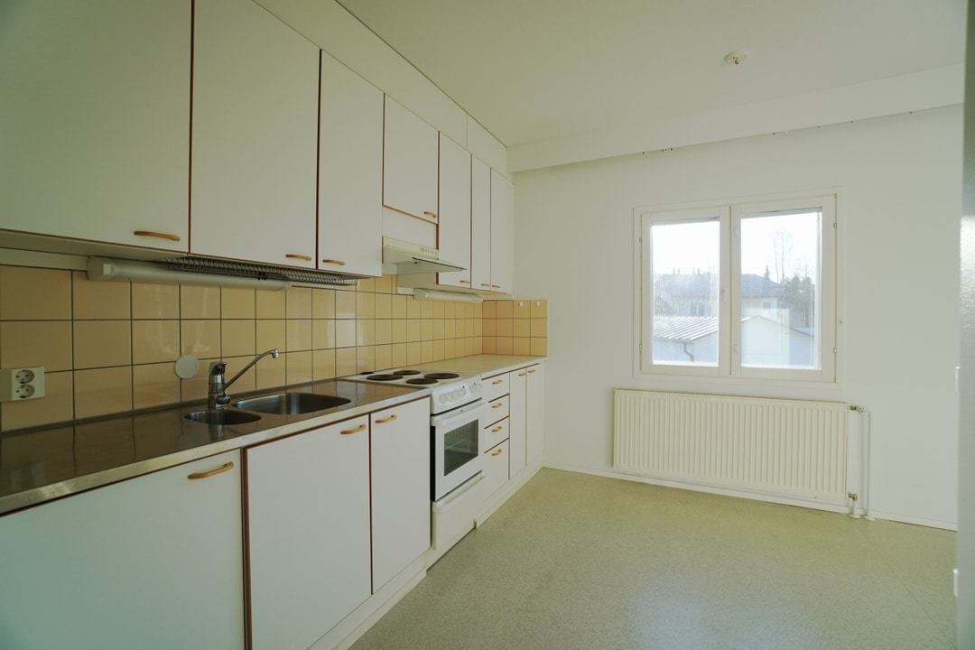 Asunto on siistissä kunnossa ja siellä on kauttaaltaan vaaleat pinnat. Olohuone ja keittiö ovat yhdessä tilassa, mikä tekee siitä yhtenäisen ja avaran.
