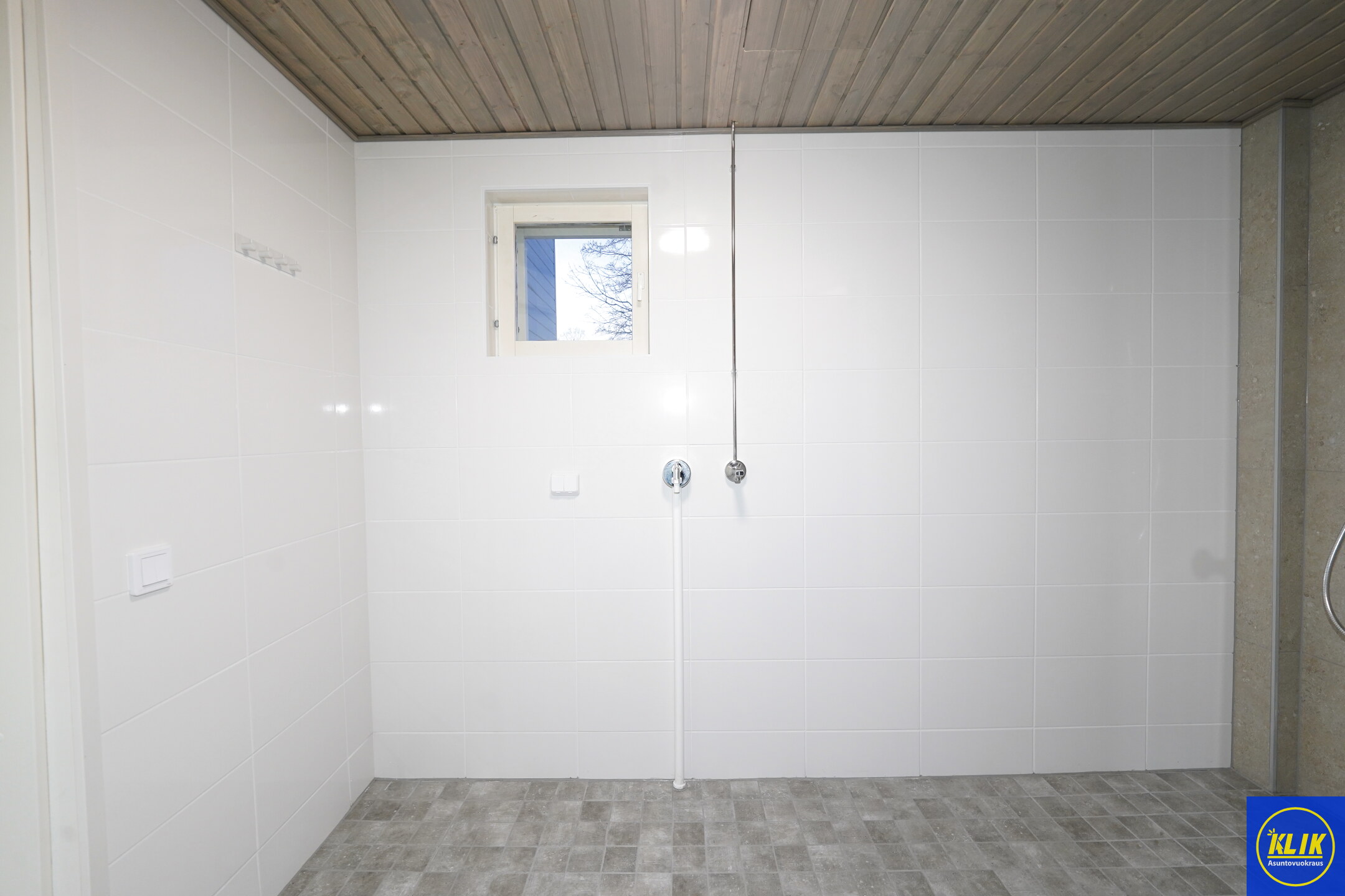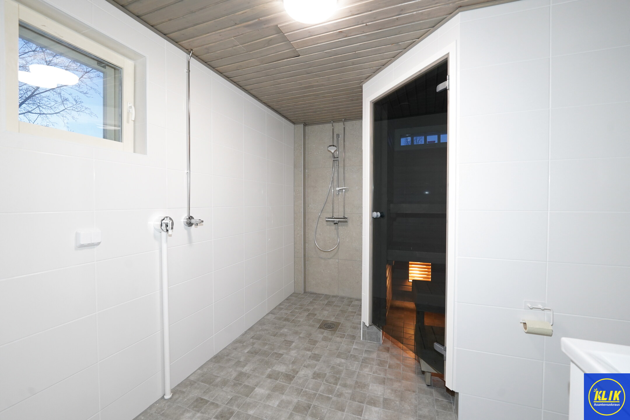 laattalattia; laattaseinä, allaskaappi; peilikaappi, suihku, pesukonevalmius, kylpyhuoneessa lattialämmitys; oma sauna; kylpyhuoneessa avattava ikkuna
