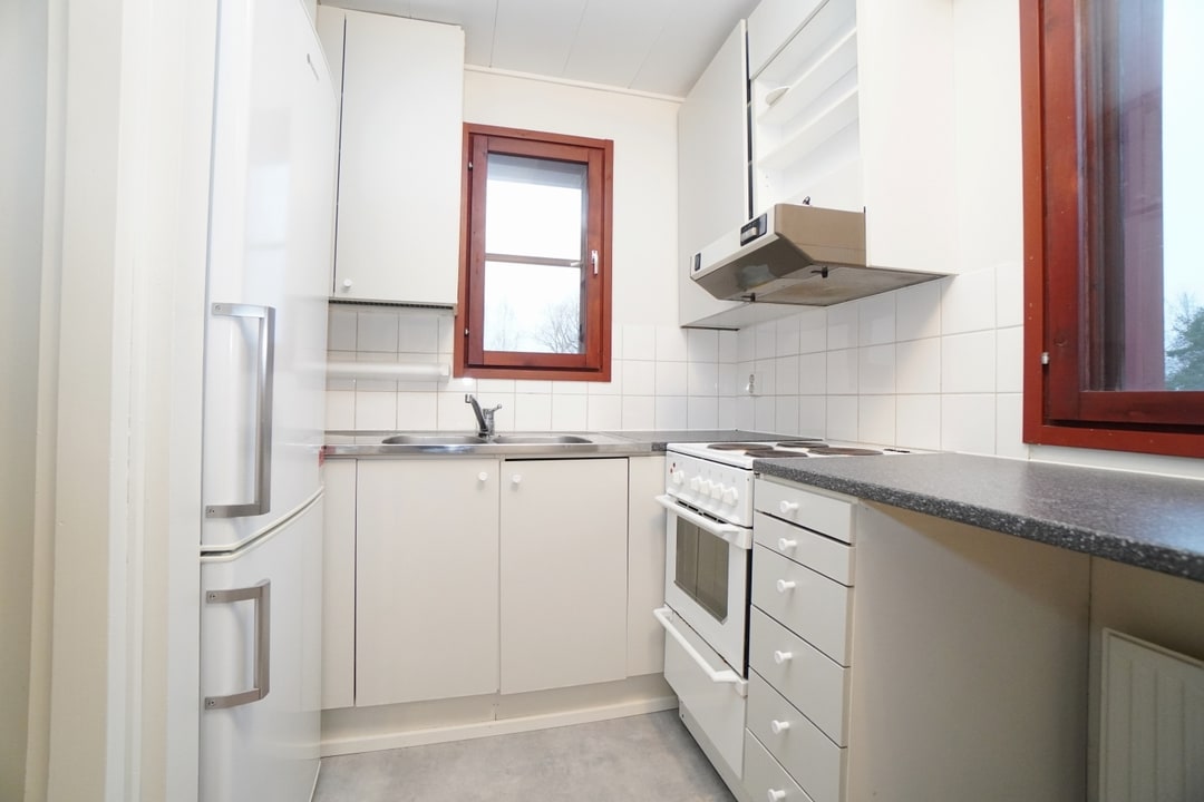 Keittiössä on varustuksena hella sekä hiljattain uusittu jääkaappipakastin. Keittiössä on myös reilusti laskutilaa ja kaapistoja.