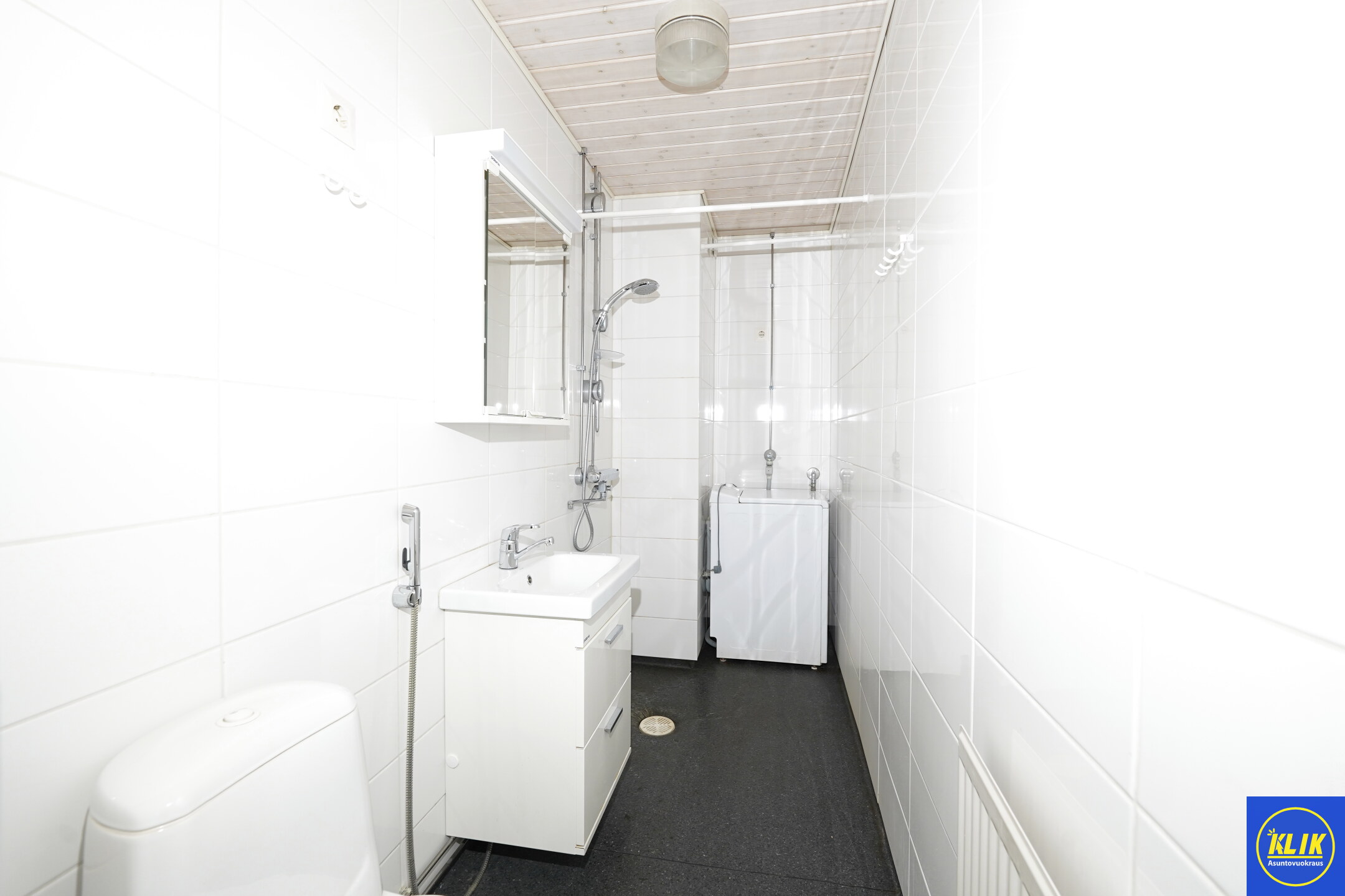 laattaseinä; epoksilattia, , allaskaappi; peilikaappi, suihku, , pesukonevalmius, taloyhtiössä sauna