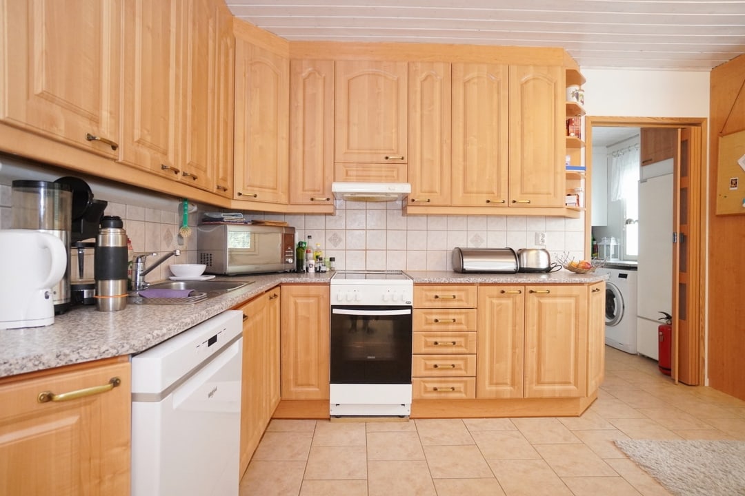 Keittiö on kauttaaltaan siistissä kunnossa ja kodinkoneet ovat hyväkuntoiset. Ruokapöydälle on hyvin tilaa ja laattalattia on keittiössä käytännöllinen.
