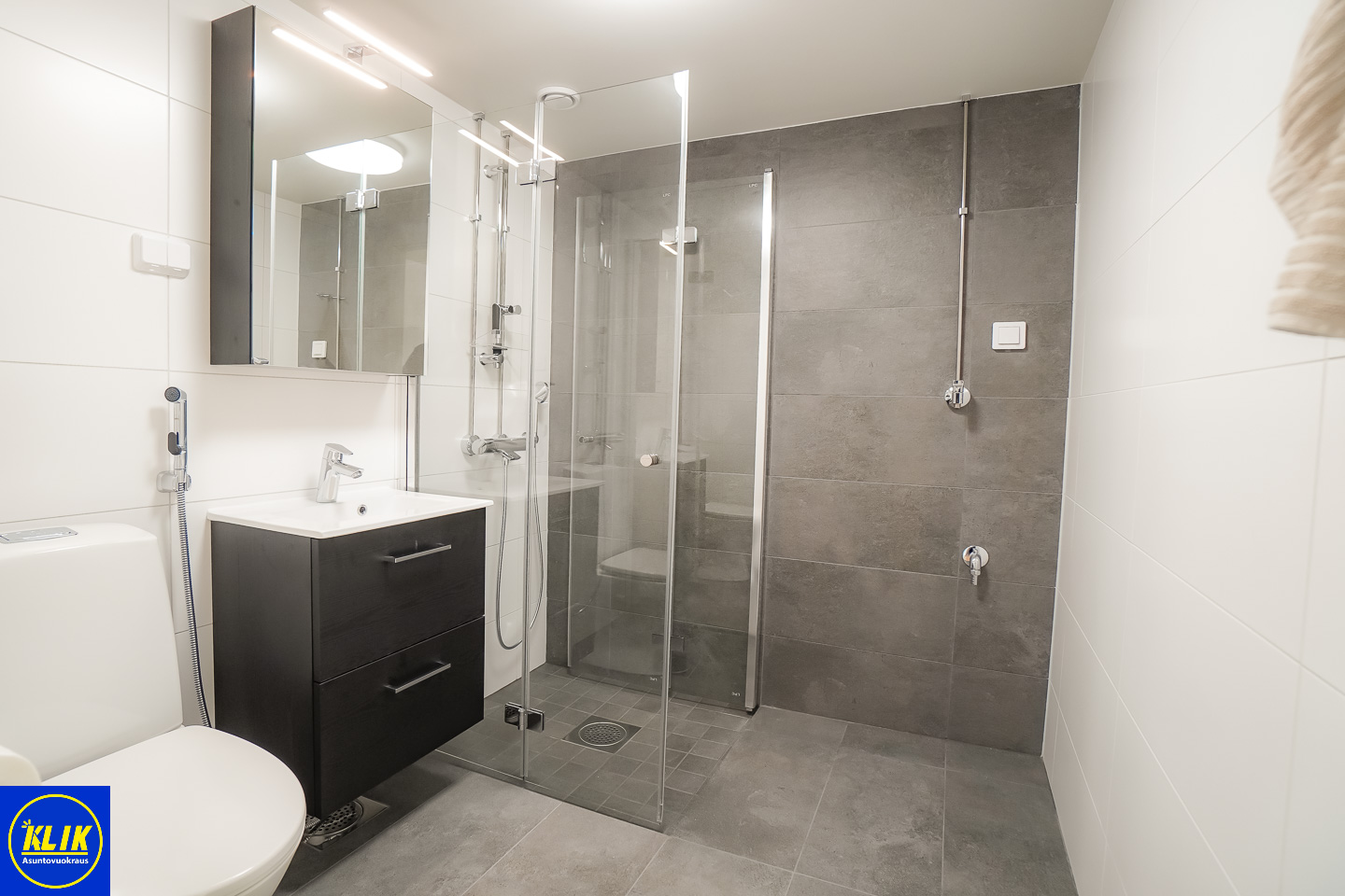 laattalattia; laattaseinä, allaskaappi; peilikaappi, suihku; suihkuseinä, pesukonevalmius, kylpyhuoneessa lattialämmitys