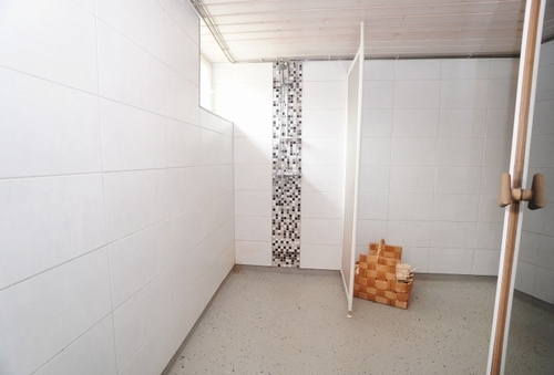 laattaseinä; epoksilattia, myös erillinen WC, allaskaappi, suihku, pesukonevalmius, sauna