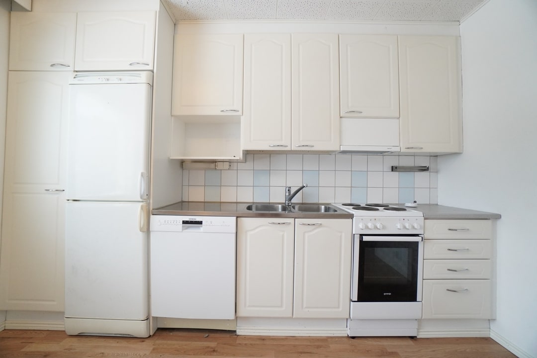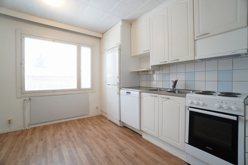 erillinen keittiö, laminaattitasot keittiössä, sähköliesi; liesituuletin, astianpesukone (60cm), jääkaappipakastin, tilaa isolle ruokapöydälle; paljon kaappitilaa; paljon työskentelytilaa; mikrohylly