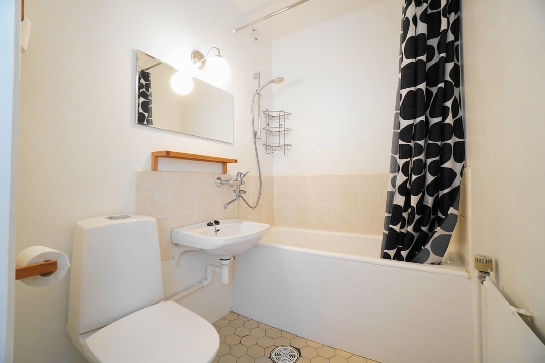Kylpyhuone on asuntoon nähden reilun kokoinen ja kylpyhuonekalusteet ovat hyväkuntoiset. Pyykinpesukoneelle on liitännät valmiina. Luksusta on oma amme!