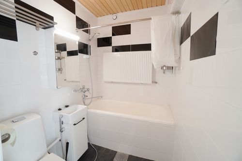 Kylpyhuone on hyvän kokoinen sekä kauttaaltaan siistikuntoinen ja kylpyhuonekalusteet ovat hyväkuntoiset. Pyykinpesukoneelle on liitännät valmiina.
