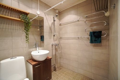 Kylpyhuone on sekin uusittu ja pyykinpesukoneelle on liitännät valmiina.