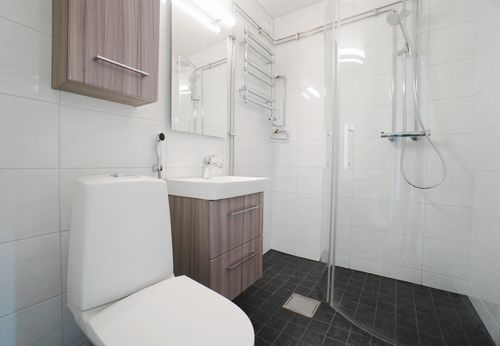 laattalattia; laattaseinä, allaskaappi; peilikaappi, suihku; suihkuseinä, pesukonevalmius, kylpyhuoneessa lattialämmitys