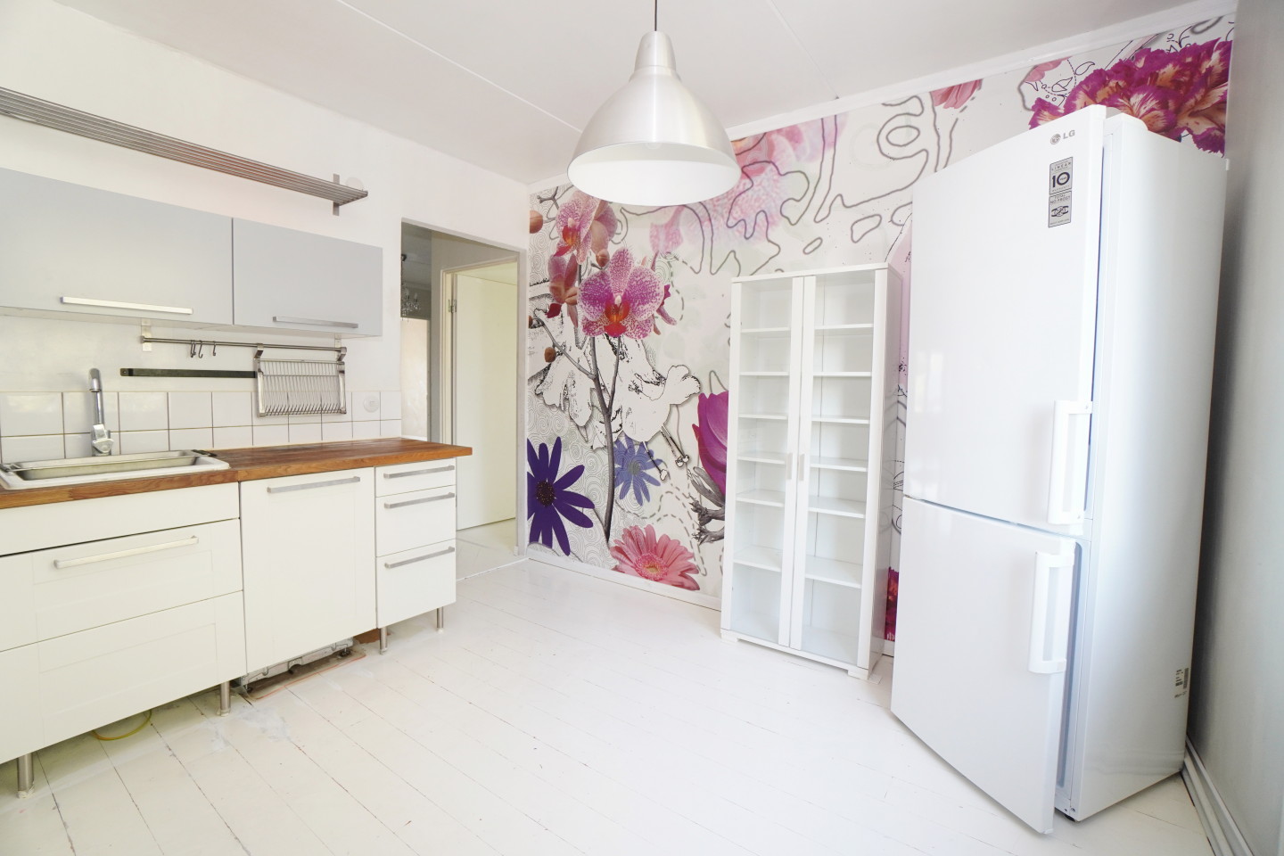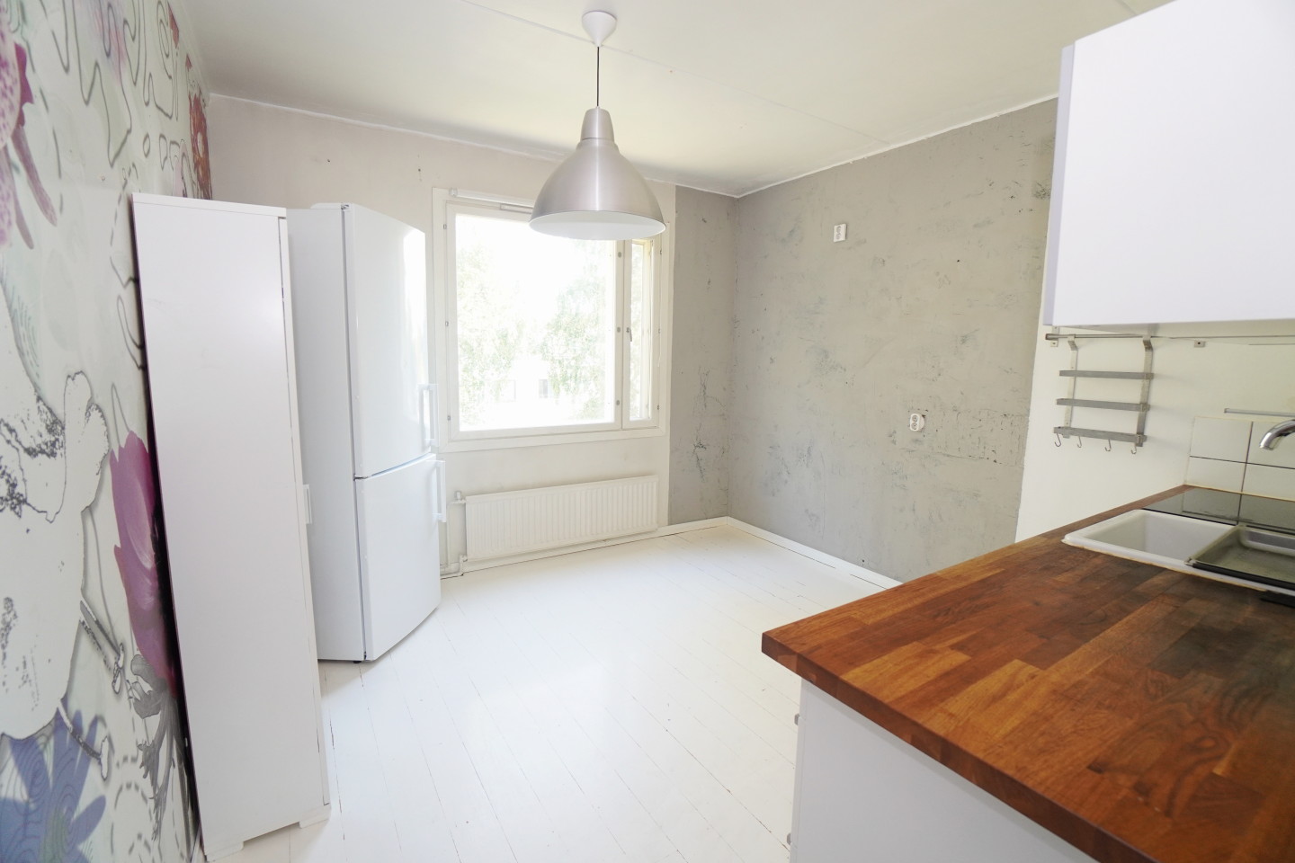 erillinen keittiöpuutasot keittiössä, sähköliesi; keraaminen- tai induktioliesi, astianpesukone (60cm); Integroitu, jääkaappipakastin, tilaa isolle ruokapöydälle; paljon kaappitilaa; paljon työskentelytilaa
