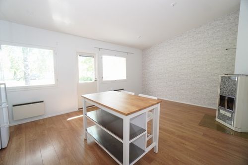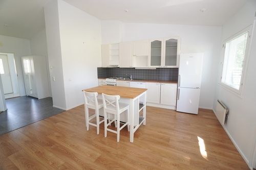 Asunto on kauttaaltaan siistissä kunnossa. Olohuone ja keittiö ovat avarasti yhtenäistä tilaa. Kivasti tilan tuntua tuo myös harjan suuntainen katto. Keittiössä on mm. hyvin kaappitilaa, jääkaappipakastin sekä astianpesukone. Keittiön yhteyteen mahtuu myös ruokailuryhmä. Keittiössä valmiina oleva saareke tuoleineen voi tarvittaessa jäädä vuokralaisen käytettäväksi.