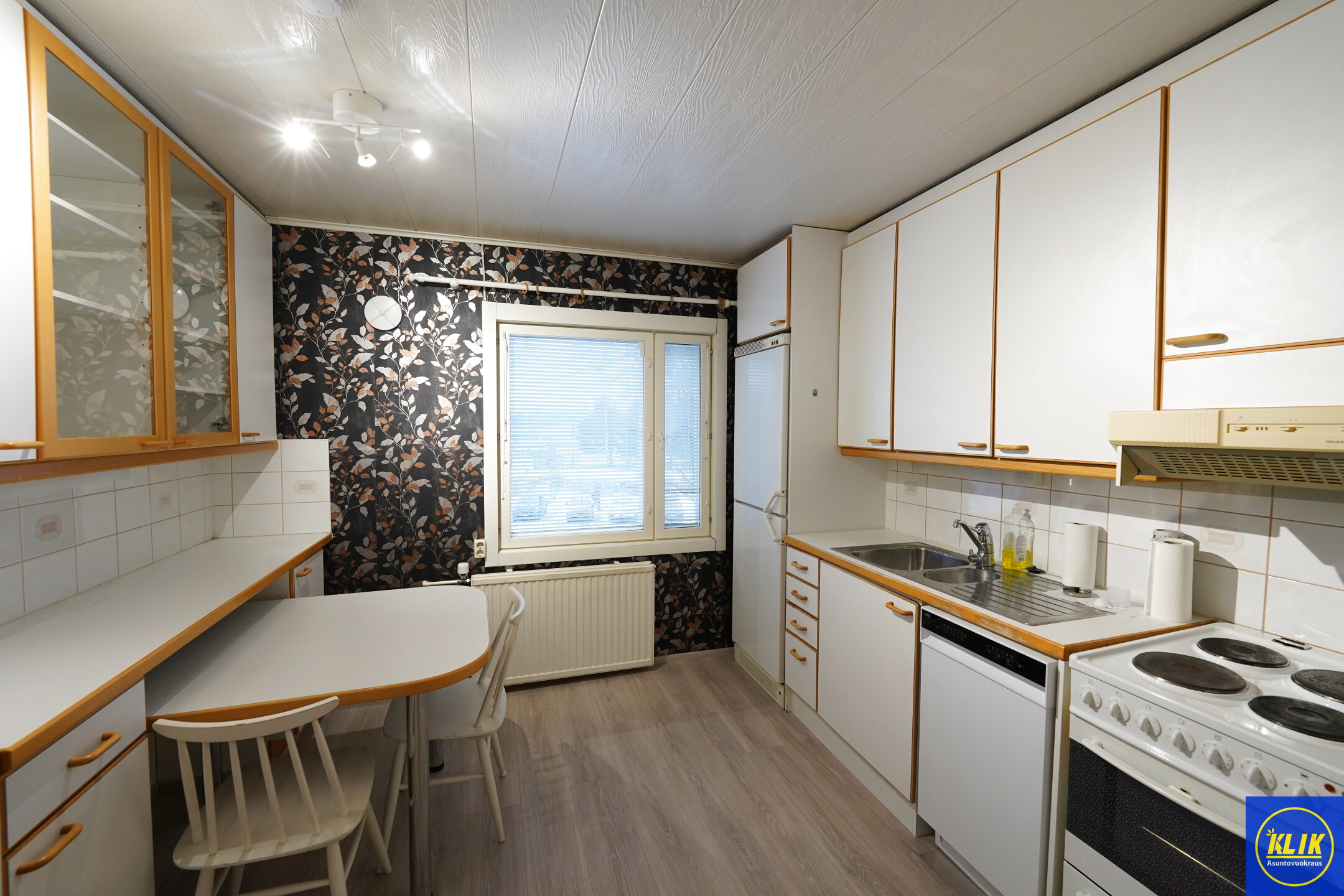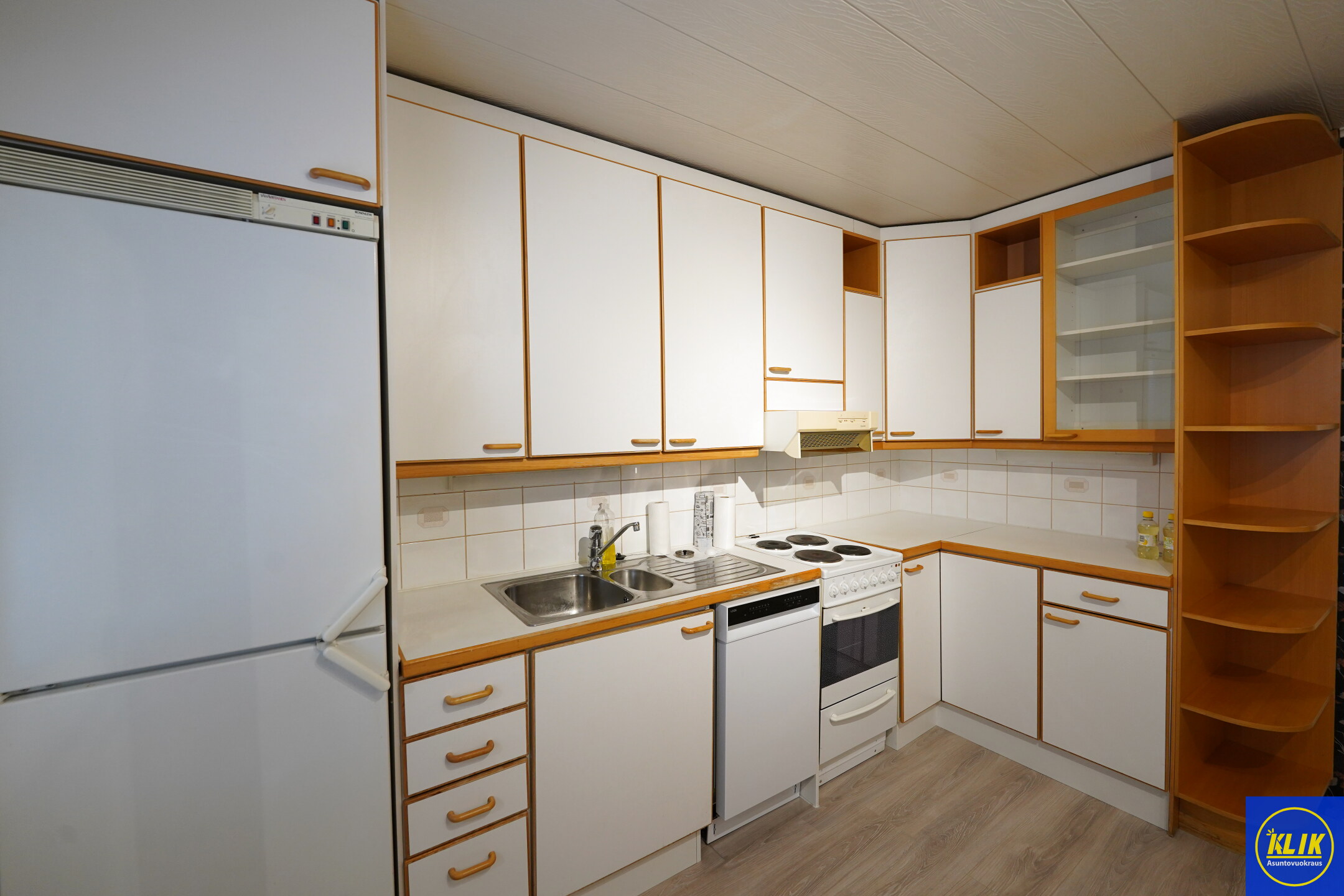 erillinen keittiölaminaattitasot keittiössä, sähköliesi; liesituuletin, astianpesukone (45cm), jääkaappipakastin, tilaa isolle ruokapöydälle; paljon kaappitilaa; paljon työskentelytilaa