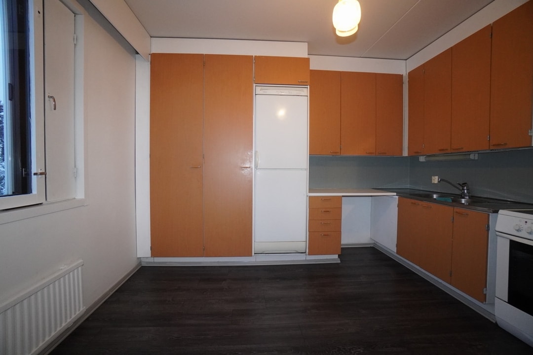 erillinen keittiö, laminaattitasot keittiössä, sähköliesi, jääkaappipakastin, tilaa isolle ruokapöydälle; paljon kaappitilaa; paljon työskentelytilaa; suuri tiskipöytä