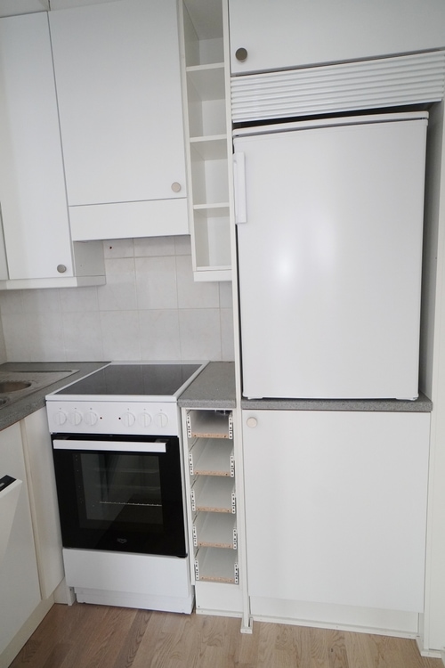 keittokomero, laminaattitasot keittiössä, keraaminen- tai induktioliesi; liesituuletin, astianpesukone (45cm); Integroitu, jääkaappi pakastelokerolla,