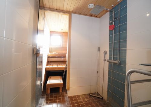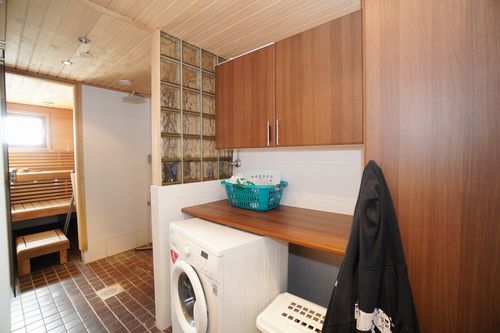 Kylpyhuoneessa on paikka pesukoneelle ja oma sauna lämpiää silloin kun sinulle sopii.