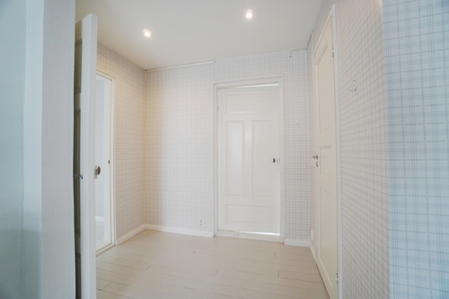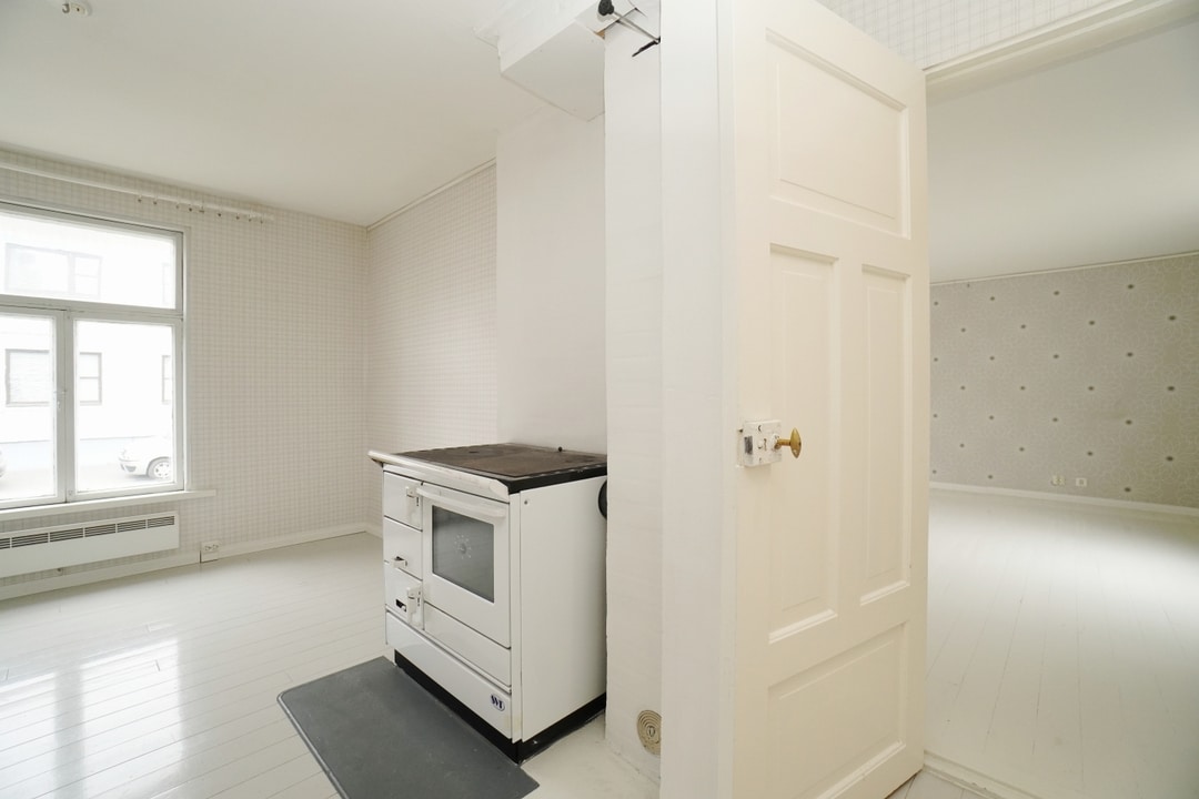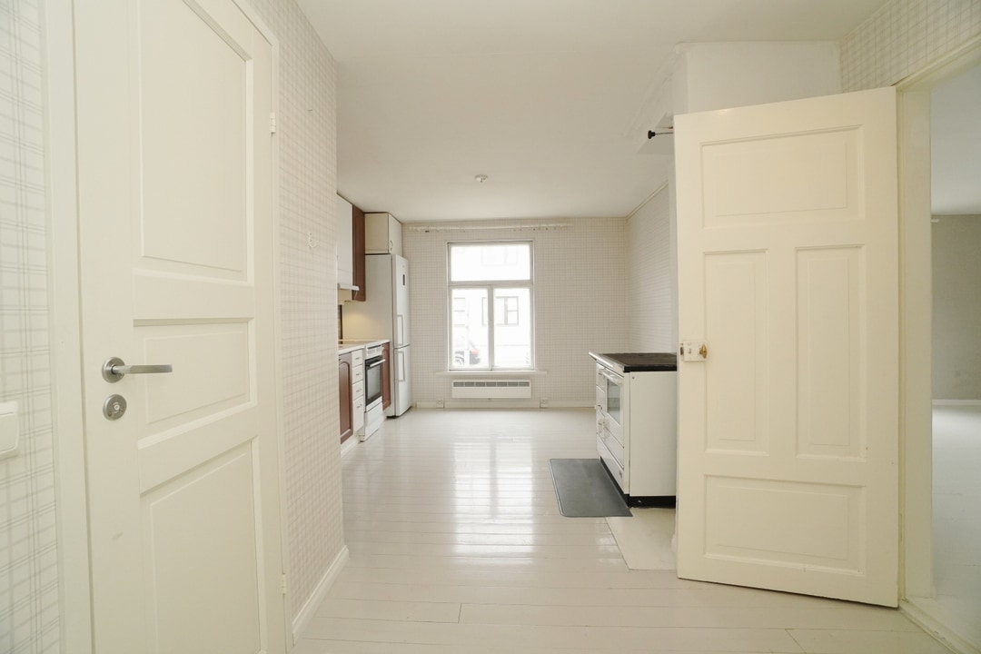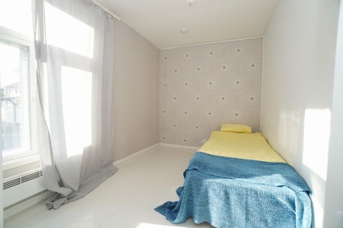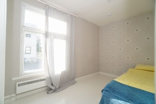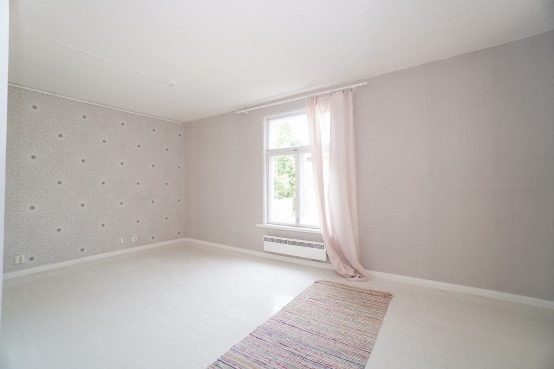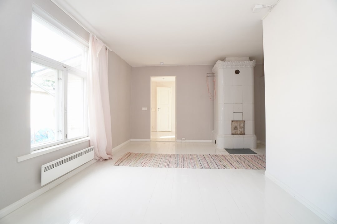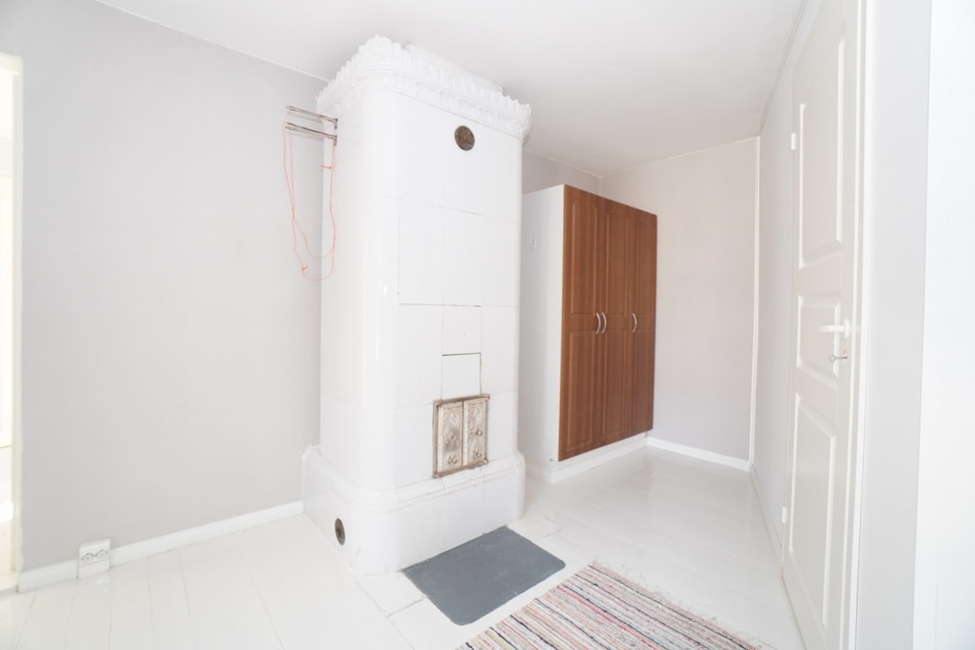 Tilavan huoneen yhteydessä on kaunis kakluuni. Tilava huone on jaettu kahteen tilaan ja huoneeseen on tehty erillinen makuuhuone.