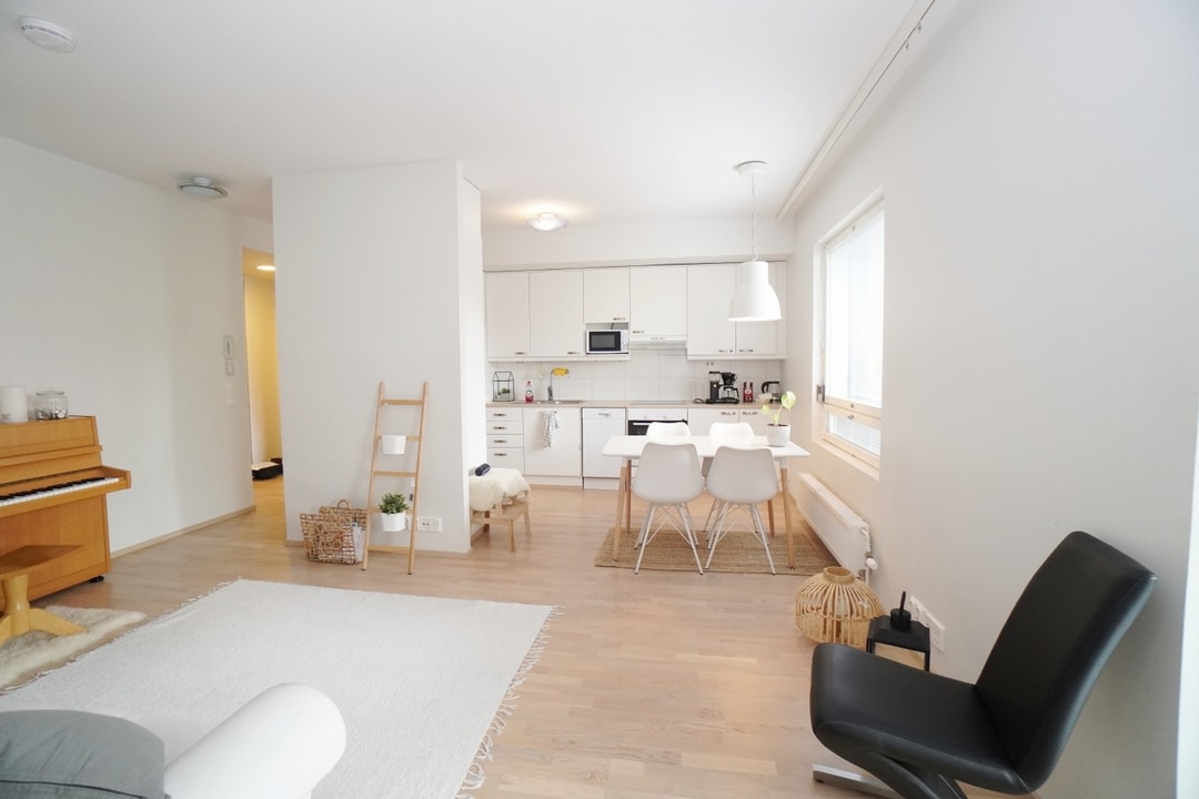 Koti on avara ja valoisa, sillä useat ikkunat tuovat sinne paljon luonnonvaloa. Vaalea parkettilattia on ajaton ja kestävä. Olohuoneesta pääsee isolle lasitetulle parvekkeelle, joka on rauhallisen suljetun sisäpihan suuntaan. Tästä saat kesäksi mainion olohuoneen jatkeen! Makuuhuone on myös rauhaisan sisäpihan suuntaan, joten kaupungin äänet eivät kuulu sinne. Makuuhuoneen yhteydessä on tilava vaatehuone.