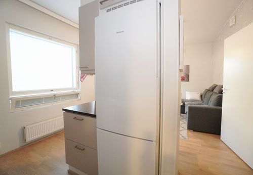 Avokeittiössä on uudenveroiset laadukkaat kodinkoneet. Saareke tuo toivottua laskutilaa, lisäksi kaappitilaa on varsin kiitettävästi. Olohuoneen kautta pääsee upealle lasitetulle parvekkeelle. Sisäpihan suuntaan oleva parveke toimii olohuoneen jatkeena pitkälle syksyyn. Lisäksi asuntoon kuuluu erillinen patio.