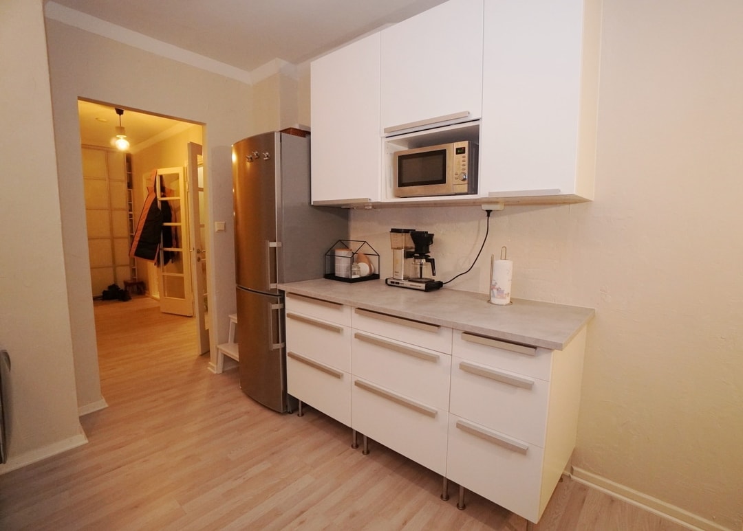erillinen keittiö, laminaattitasot keittiössä, keraaminen- tai induktioliesi; liesi ja uuni erikseen; liesituuletin, astianpesukone (60cm); Integroitu, jääkaappipakastin, tilaa isolle ruokapöydälle; paljon kaappitilaa; paljon työskentelytilaa; mikro valmiina keittiössä; mikrohylly
