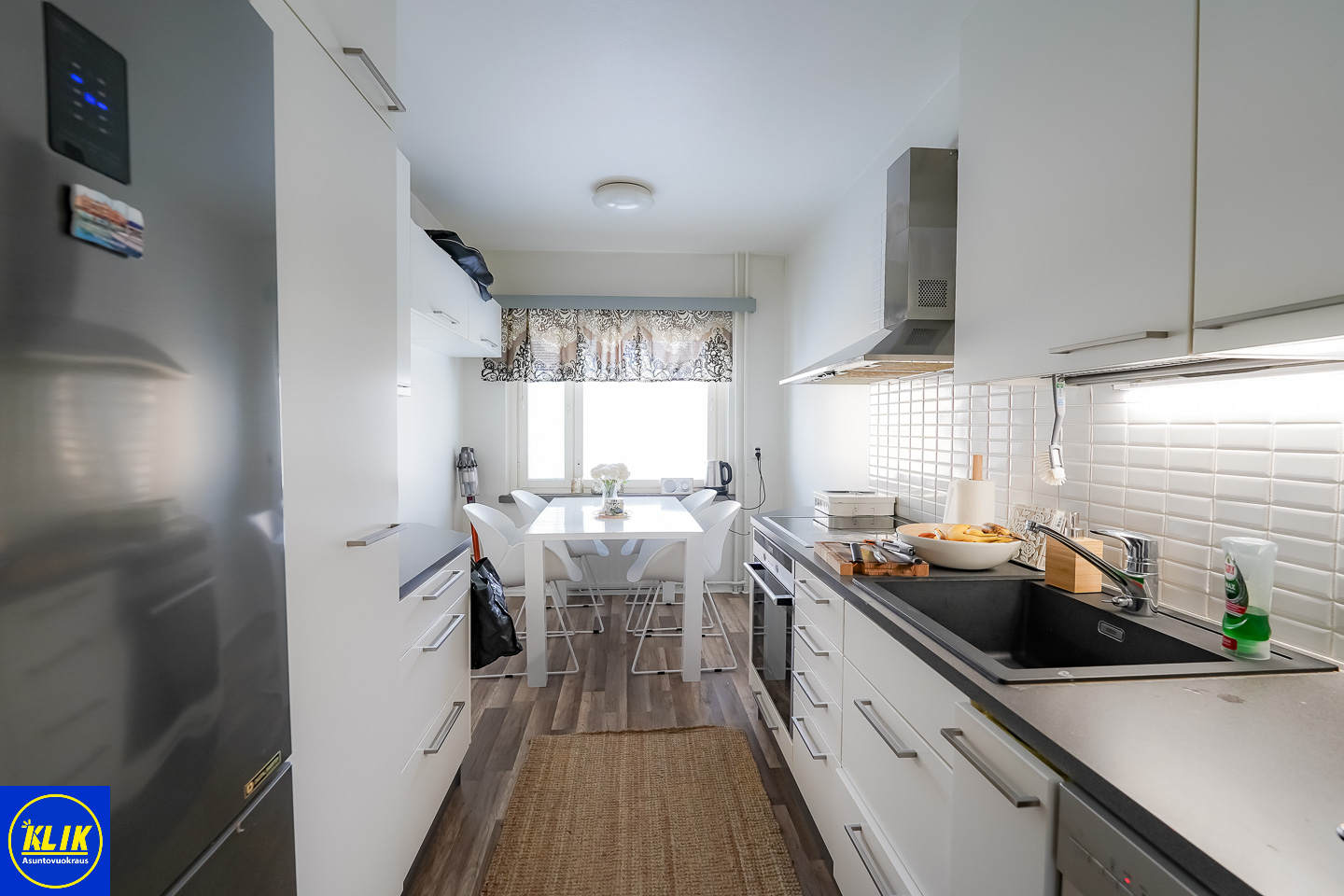 erillinen keittiölaminaattitasot keittiössä, keraaminen- tai induktioliesi; keittotaso ja kalusteuuni; liesituuletin, astianpesukone (45cm); pesukoneliitos, astianpesukone on mahdollista asentaa, jääkaappi; pakastin, mikrohylly