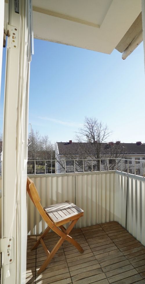 Olohuone on tilava ja sen yhteydessä on pieni parveke. Makuuhuoneessa on koko seinän mitalta säilytystilaa ja huoneeseen mahtuu parisänky.