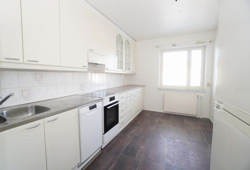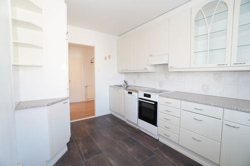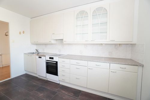 Keittiössä on valkoiset kaapistot sekä hyväkuntoiset kodinkoneet sekä astianpesukone. Keittiössä on hyvä paikka ruokapöydälle.