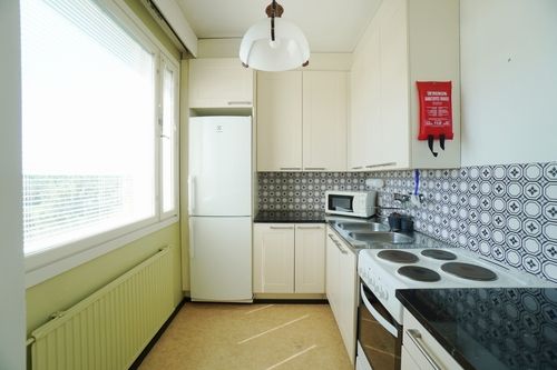 Yleisilmeeltään siisti asunto, lattiat ovat vaaleat ja seinät tapetoitu / maalattu. Asunnossa alkovi, johon saa hyvin parisängynkin ja tarvittaessa verhon / tilanjakajan saa kiinnitettyä kattokiskoihin. Keittiö on kauttaaltaan hyvässä kunnossa ja kodinkoneet ovat siistit. Siistissä kylpyhuoneessa on hyvä tila pesukoneelle. Taloyhtiöön asennettu ovipuhelin ja automaattiovi. Ylimmästä kerroksesta on hienot näkymät kattojen ylle!