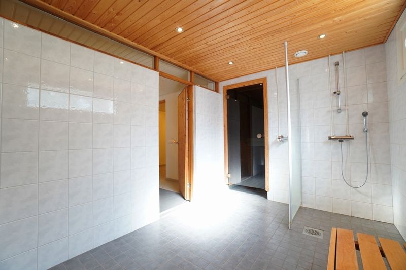 Kauttaaltaan laatoitetussa kylpyhuoneessa on liitännät pyykinpesukoneelle.