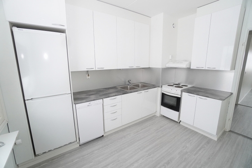 Keittiö on remontoitu vaalein sävyin ja kodinkoneet ovat siistit. Keittiöön on juuri asennettu uusi astianpesukone.