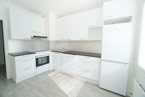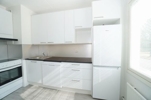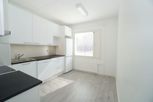erillinen keittiö, laminaattitasot keittiössä, keraaminen- tai induktioliesi; liesituuletin, astianpesukone (60cm), jääkaappipakastin, tilaa isolle ruokapöydälle; paljon kaappitilaa; paljon työskentelytilaa; mikrohylly