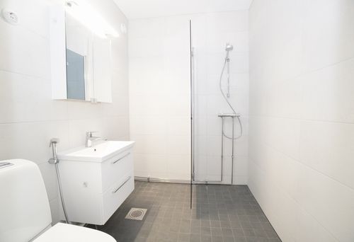 laattalattia; laattaseinä, allaskaappi; peilikaappi, suihku; suihkuseinä, pesukonevalmius, lattialämmitys