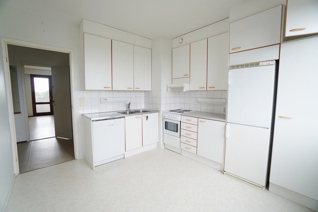 erillinen keittiö, laminaattitasot keittiössä, sähköliesi; liesituuletin, astianpesukone (60cm), jääkaappipakastin, tilaa isolle ruokapöydälle; paljon kaappitilaa; paljon työskentelytilaa