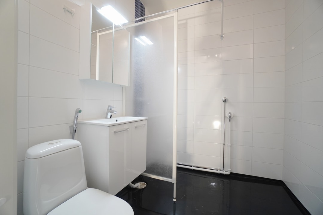 laattaseinä; epoksilattia, allaskaappi; peilikaappi, suihku; suihkuseinä, pesukonevalmius,
