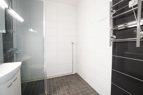Hiljattain remontoidussa kylpyhuoneessa on liitännät pesukoneelle ja uudenveroiset kalusteet.