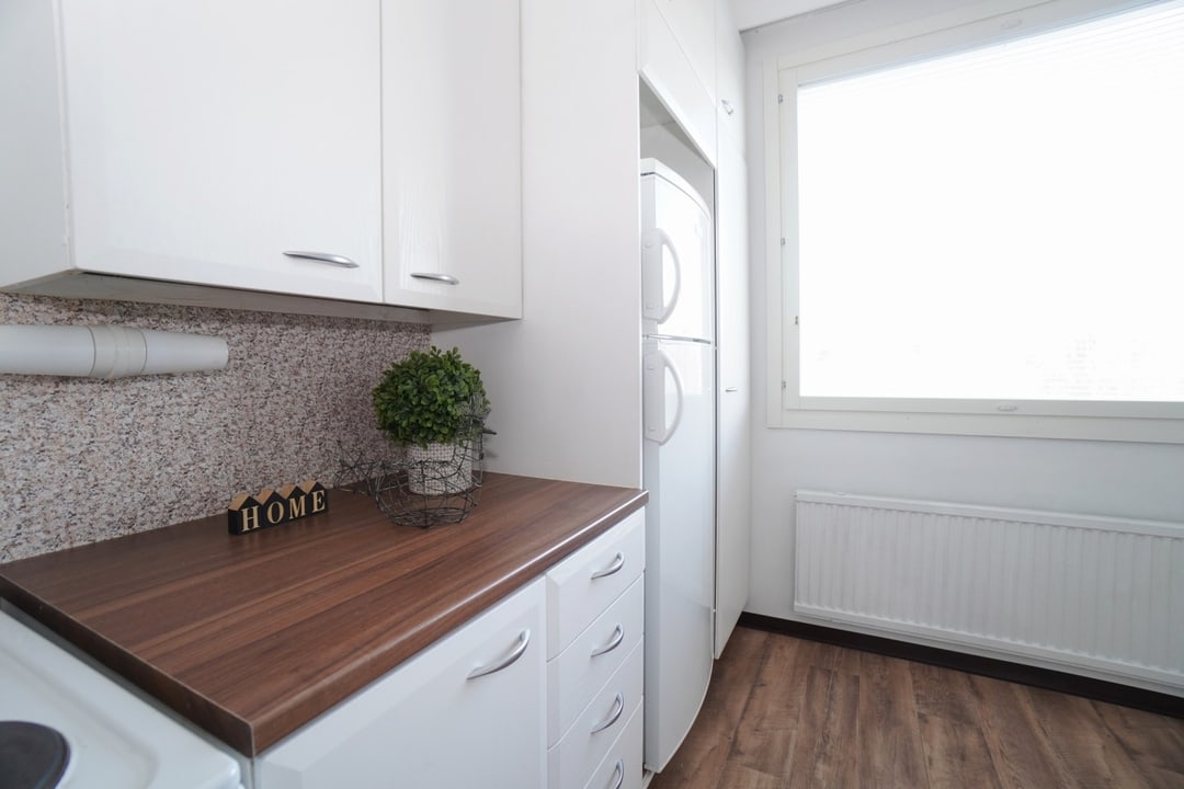 Valoisa asunto jossa on hyvän kokoiset huoneet ja siistit pinnat. Keittiössä on runsaasti kaapistoja ja työskentelytilaa. Olohuoneen yhteydessä on lasitettu parveke puistoisilla maisemilla. Makuuhuoneessa on vaatekaapit ja lisää säilytystilaa tuo erillinen vaatehuone. Avaraan eteistilaan mahtuu myös säilytyskalusteita tarvittaessa.