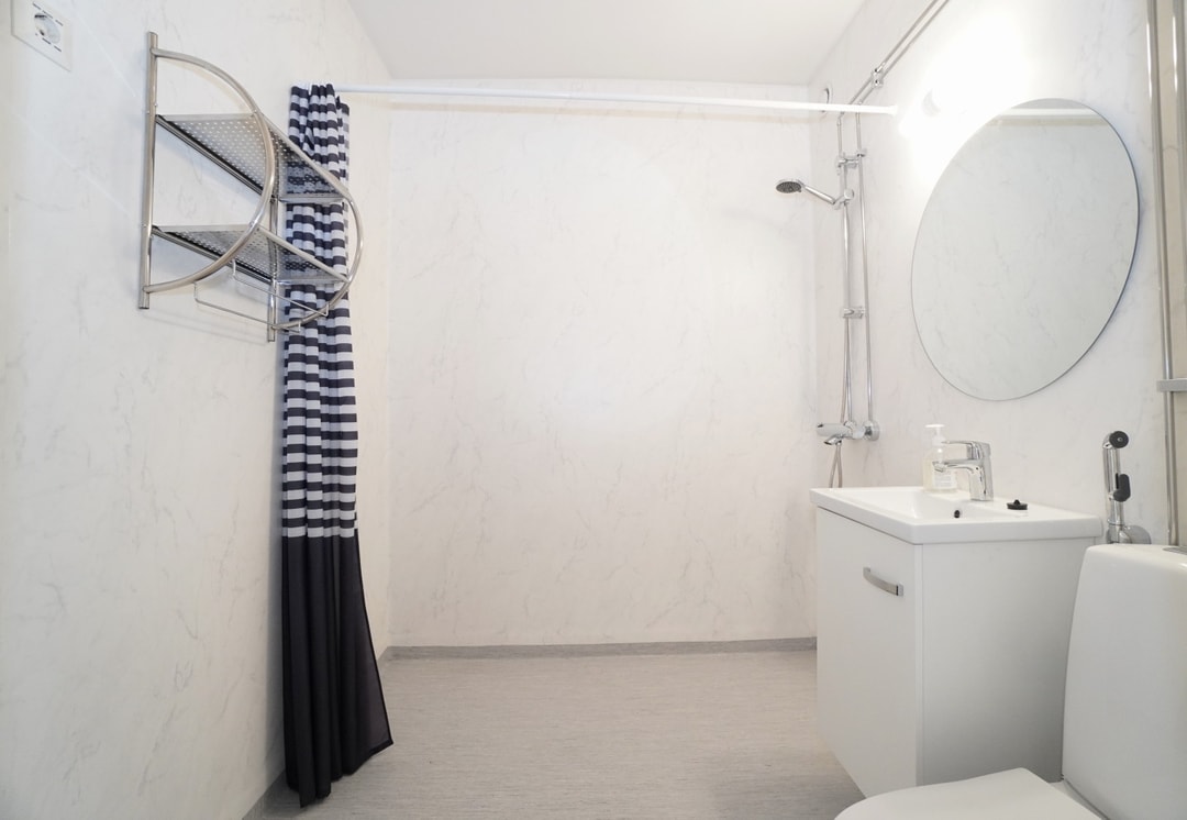 Kylpyhuone on hyvin siistikuntoinen ja pesukoneelle on liitännät. Tilaan mahtuu myös lisäksi vaikka lisähylly säilytystä varten.