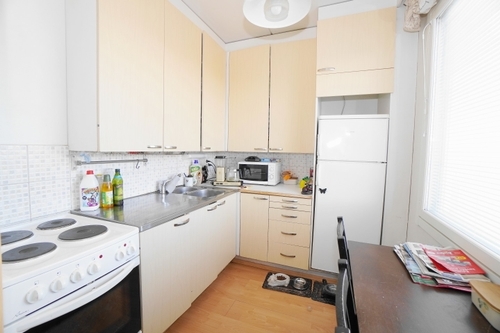 keittokomero, terästasot keittiössä; laminaattitasot keittiössä, sähköliesi, jääkaappi pakastelokerolla, suuri tiskipöytä