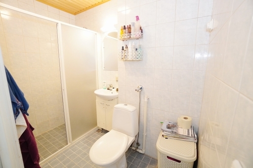 Alkoviin saa sängyn ja huone itsessään on tilava ja valoisa. Kylpyhuone on todella siistissä kunnossa ja pesukone mahtuu tilaan hyvin.