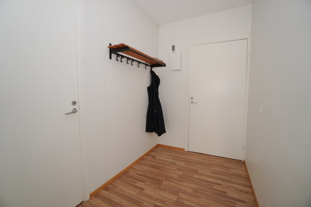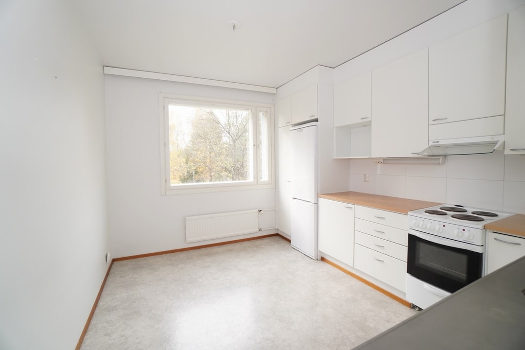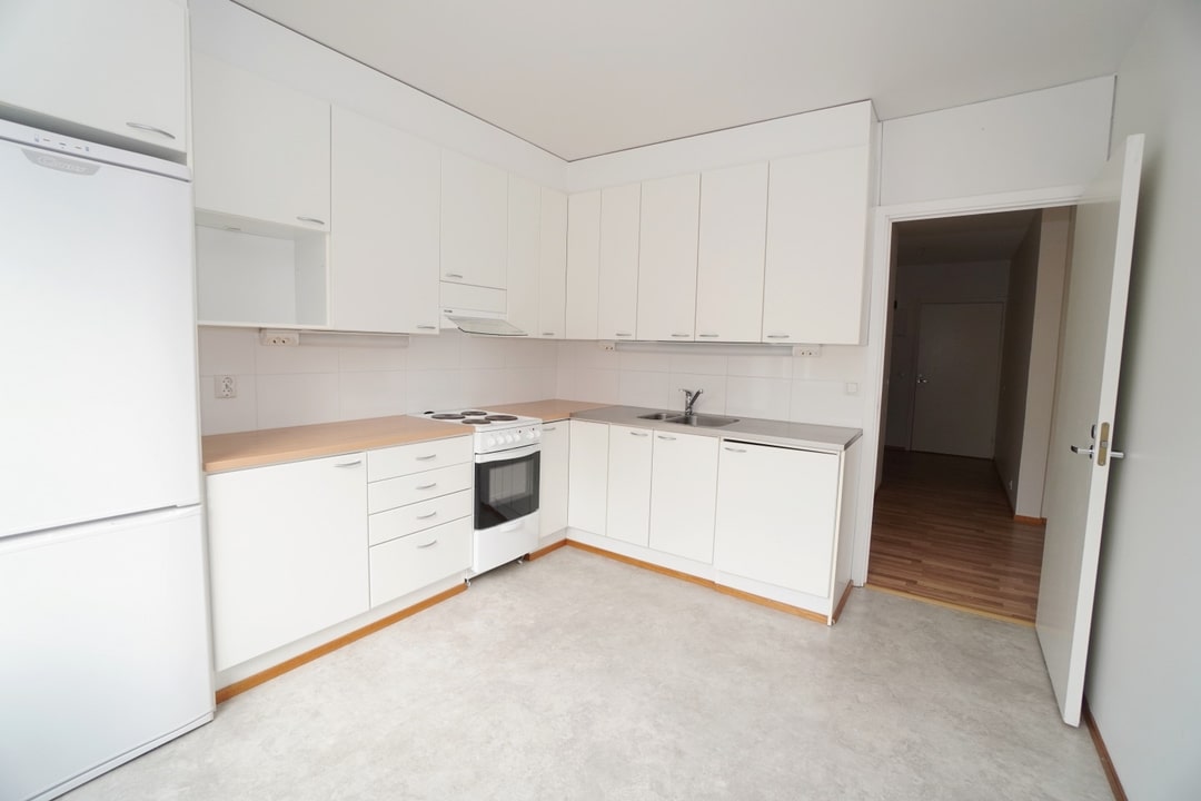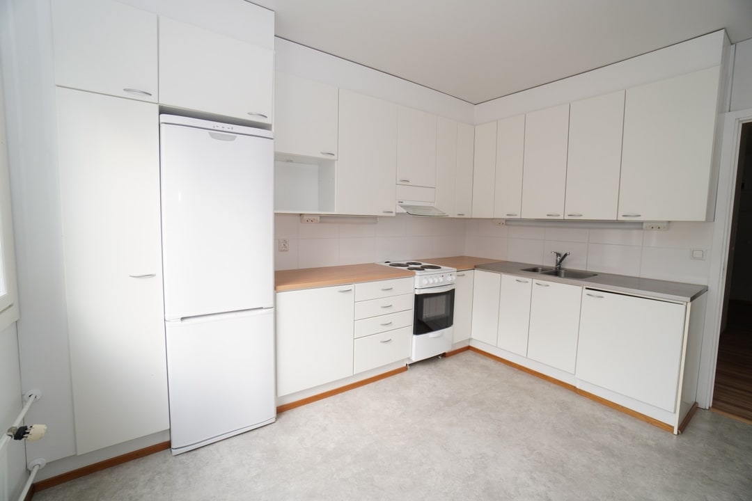 Makuuhuoneeseen saa parisängyn ja kaksi isoa vaatehuonetta tuo mainiosti säilytystilaa. Keittiössä on runsaasti kaapistoja ja hyväkuntoiset kodinkoneet. Kylpyhuoneessa on liitännät pyykinpesukoneelle.