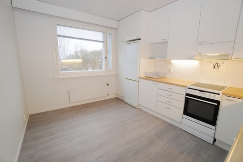 erillinen keittiö, laminaattitasot keittiössä, sähköliesi; liesituuletin, pesukoneliitos, jääkaappi; pakastin, tilaa isolle ruokapöydälle; paljon kaappitilaa; suuri tiskipöytä; mikrohylly