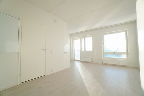 Keittiössä on modernit kodinkoneet ja hyvin kaappitilaa. Keittiö ja olohuone ovat yhtenäistä tilaa, joka tuo asuntoon tilan tuntua. Lasitettu parveke on varustettu huikeilla ylimmän kerroksen näkymillä. Asuntoon kuuluu tilava makuuhuone, jossa on myös reilusti kaapistoja säilytystä ajatellen. Kylpyhuoneessa on pyykinpesukoneelle liitännät valmiina.
