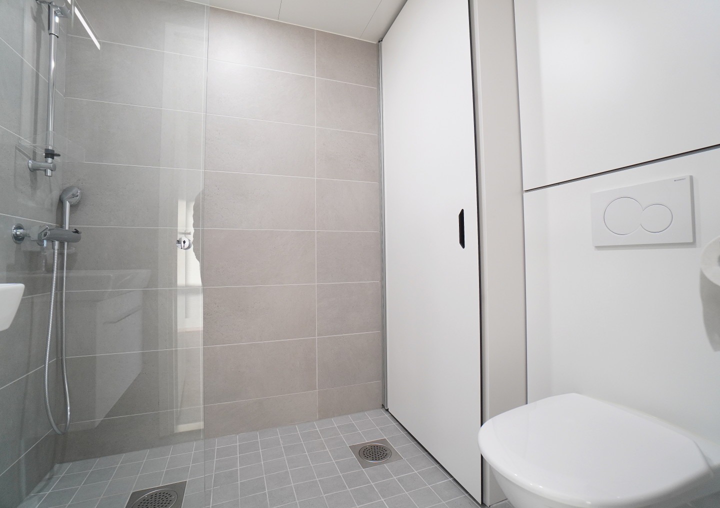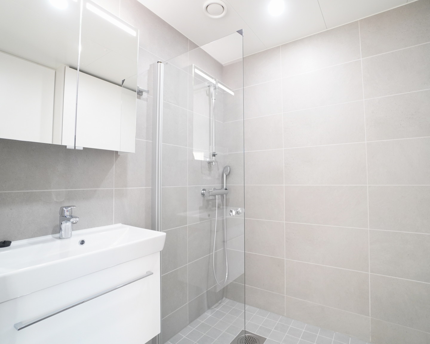 laattalattia; laattaseinä, allaskaappi; peilikaappi, suihku; suihkuseinä, pesukonevalmius, kylpyhuoneessa lattialämmitys