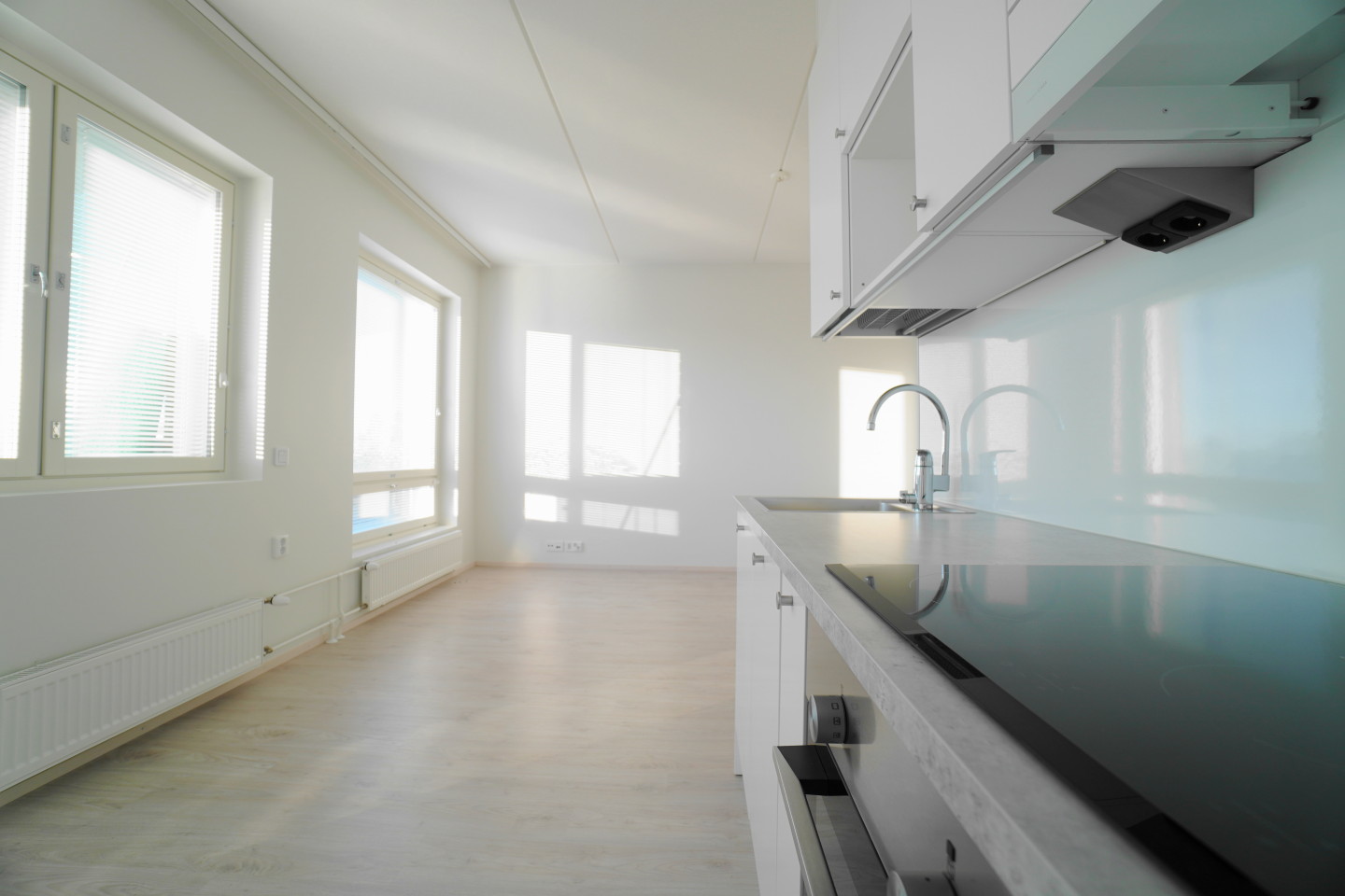 avokeittiölaminaattitasot keittiössä, keraaminen- tai induktioliesi; keittotaso ja kalusteuuni; liesituuletin, astianpesukone (45cm); integroitu, jääkaappipakastin; integroitu, tilaa isolle ruokapöydälle; paljon kaappitilaa; paljon työskentelytilaa; mikrohylly