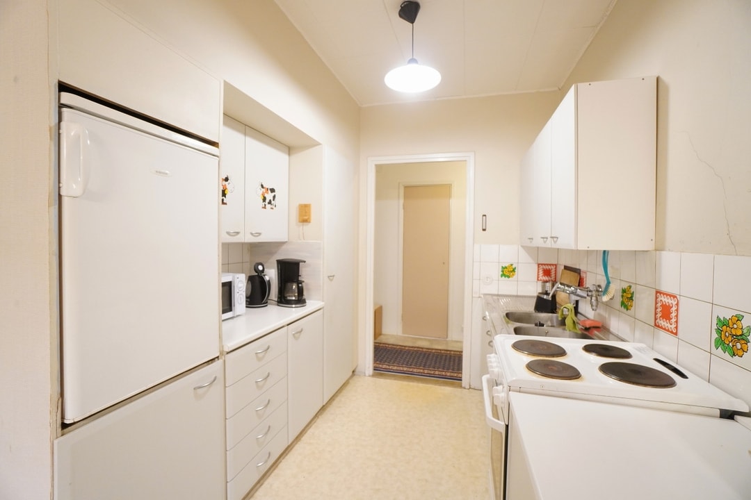 erillinen keittiö, terästasot keittiössä; laminaattitasot keittiössä, sähköliesi, jääkaappi, paljon kaappitilaa