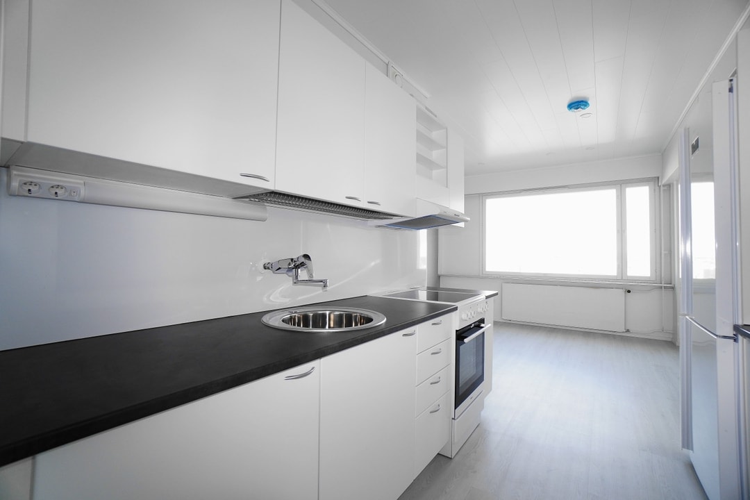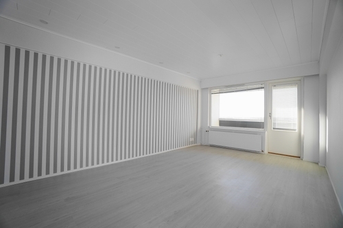 Asunnon lattiassa on vaalea yhtenäinen laminaatti kauttaaltaan ja seinäpinnat on uusittu. Olohuone on todella tilava ja sinne mahtuvat varmasti kaikki kalusteet.