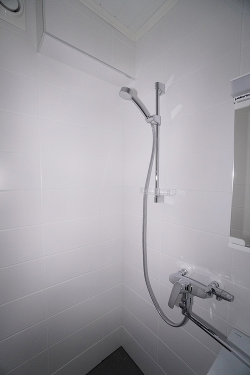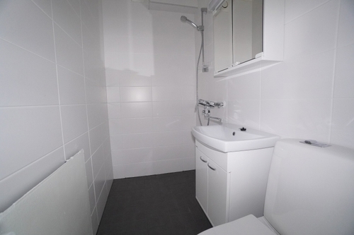 laattalattia; laattaseinä, allaskaappi; peilikaappi, suihku, pesukonevalmius