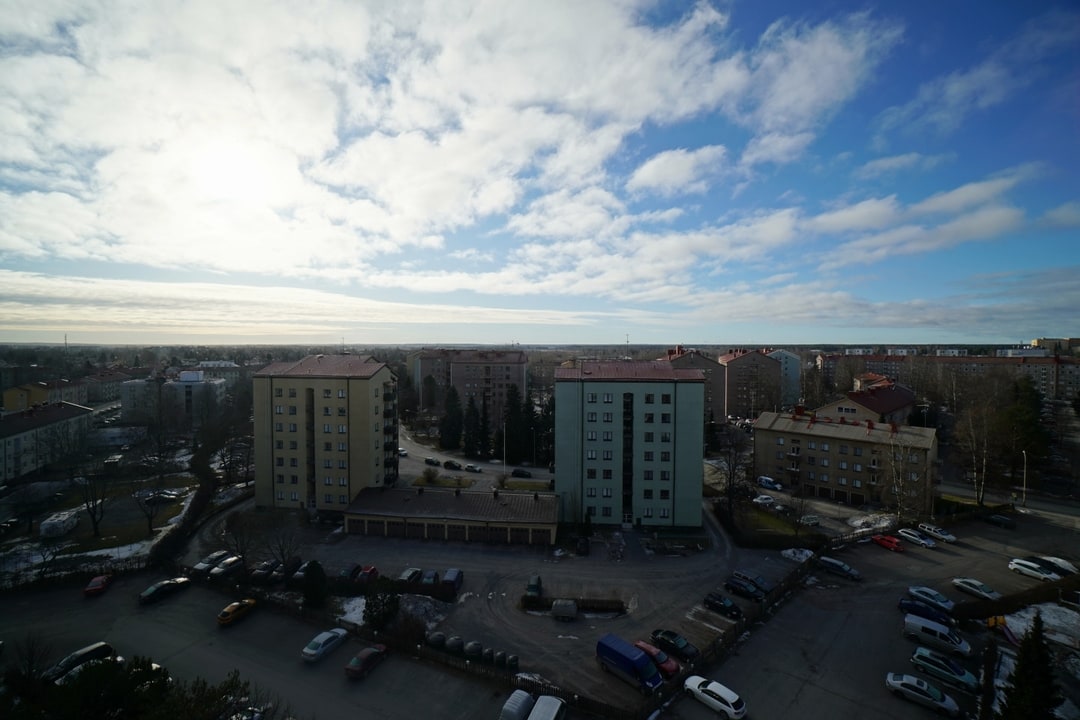 10. kerroksen lasitetulta parvekkeelta on huikeat näkymät. Kaupungin äänet eivät kantaudu ylimpiin kerroksiin joten asumisrauha on taattu.