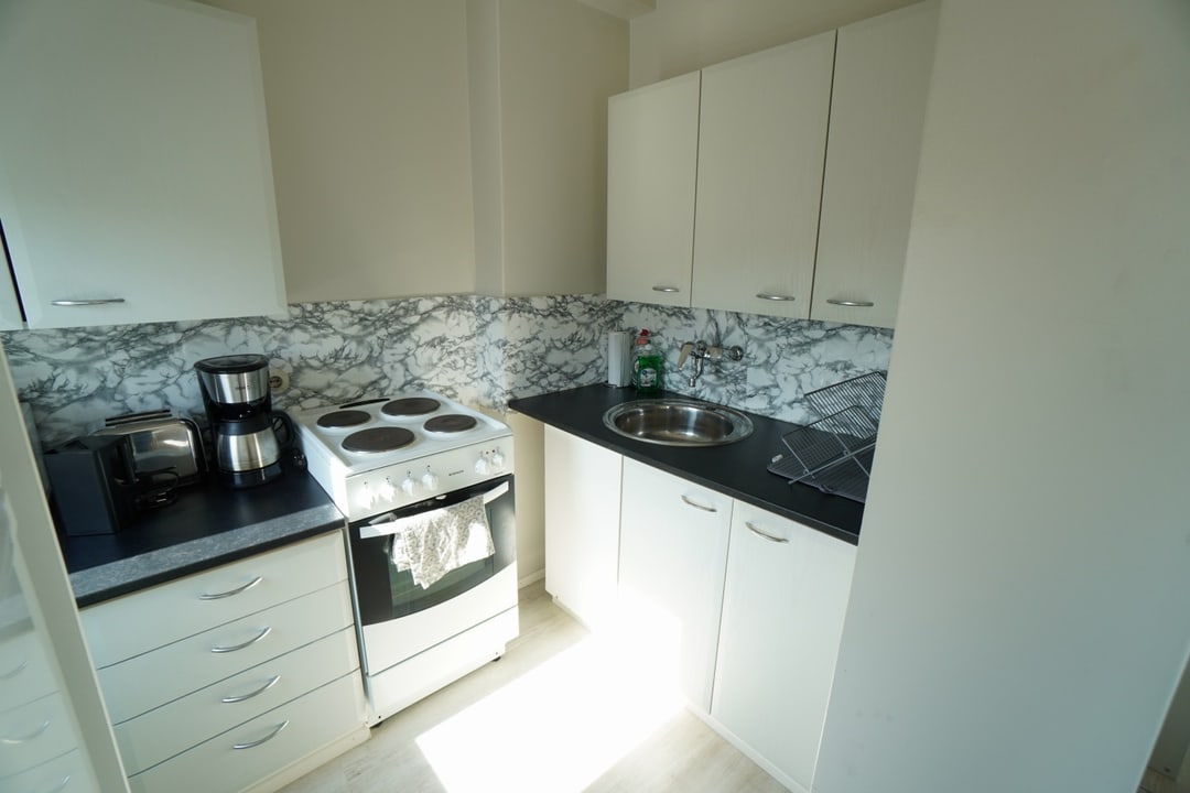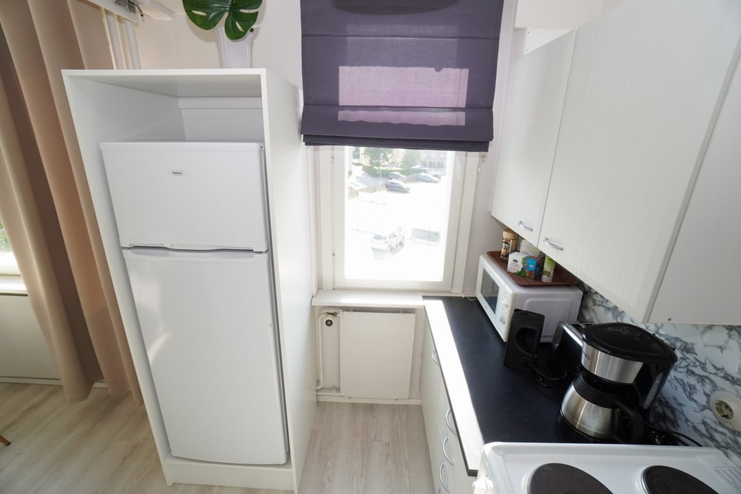 keittokomero, laminaattitasot keittiössä, sähköliesi, jääkaappi pakastelokerolla, mikro valmiina keittiössä