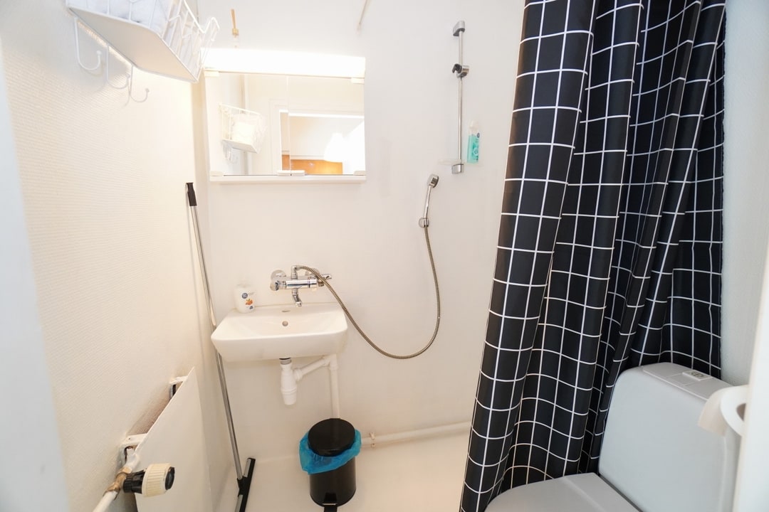 muovimatto; suihkutapetti, peilikaappi, suihku, pesukonevalmius; taloyhtiössä pesutupa,