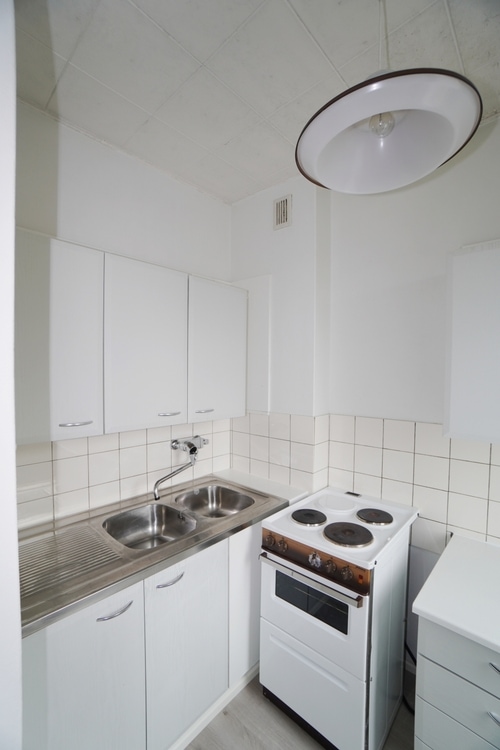 keittokomero, laminaattitasot keittiössä, sähköliesi, jääkaappi