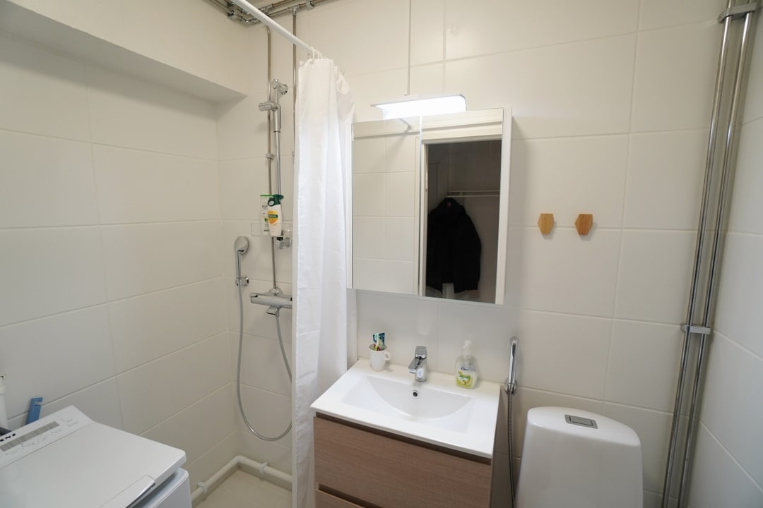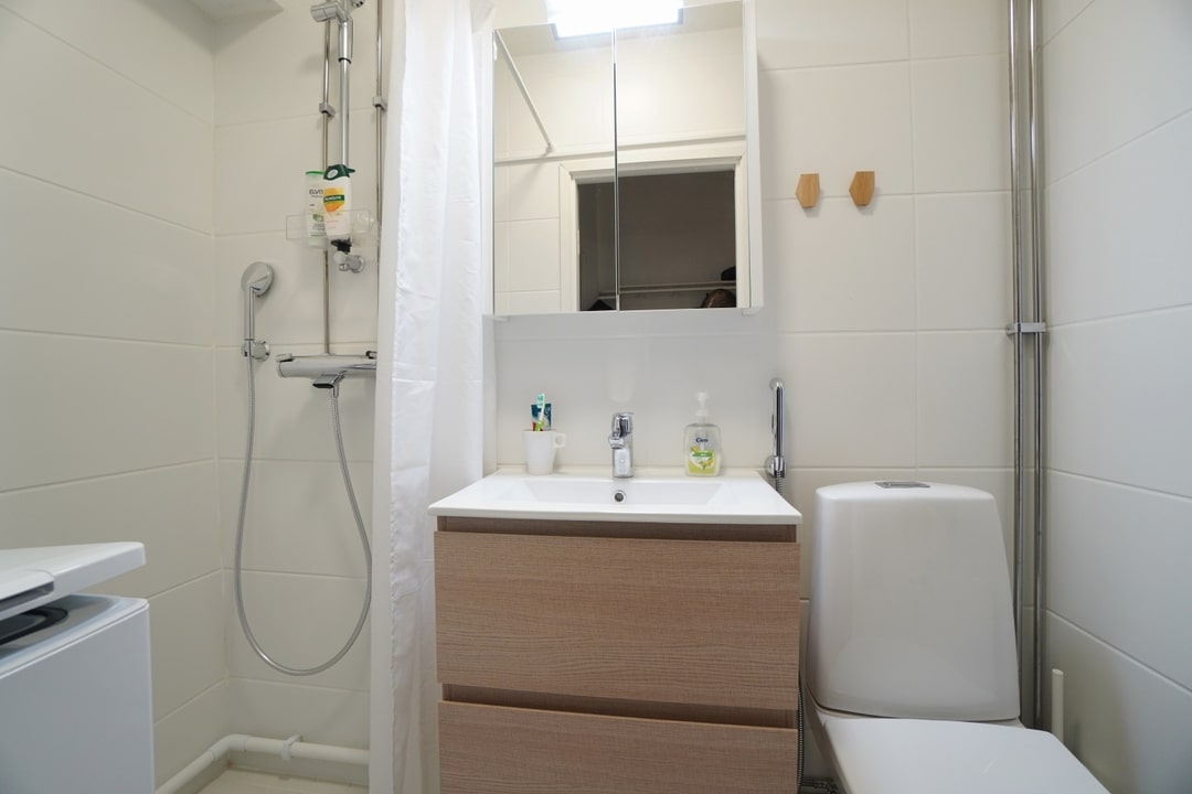 laattalattia; laattaseinä, allaskaappi; peilikaappi, suihku, pesukonevalmius; taloyhtiössä pesutupa,